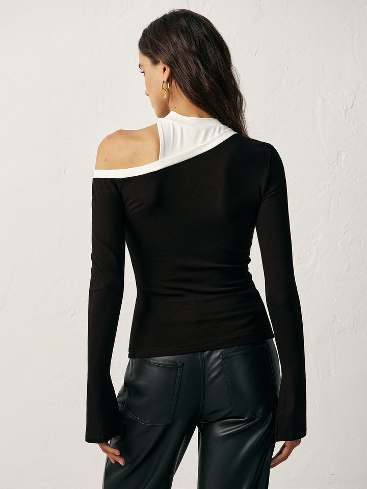Color Block Asymmetric Cut-Out Long Sleeve T-Shirt