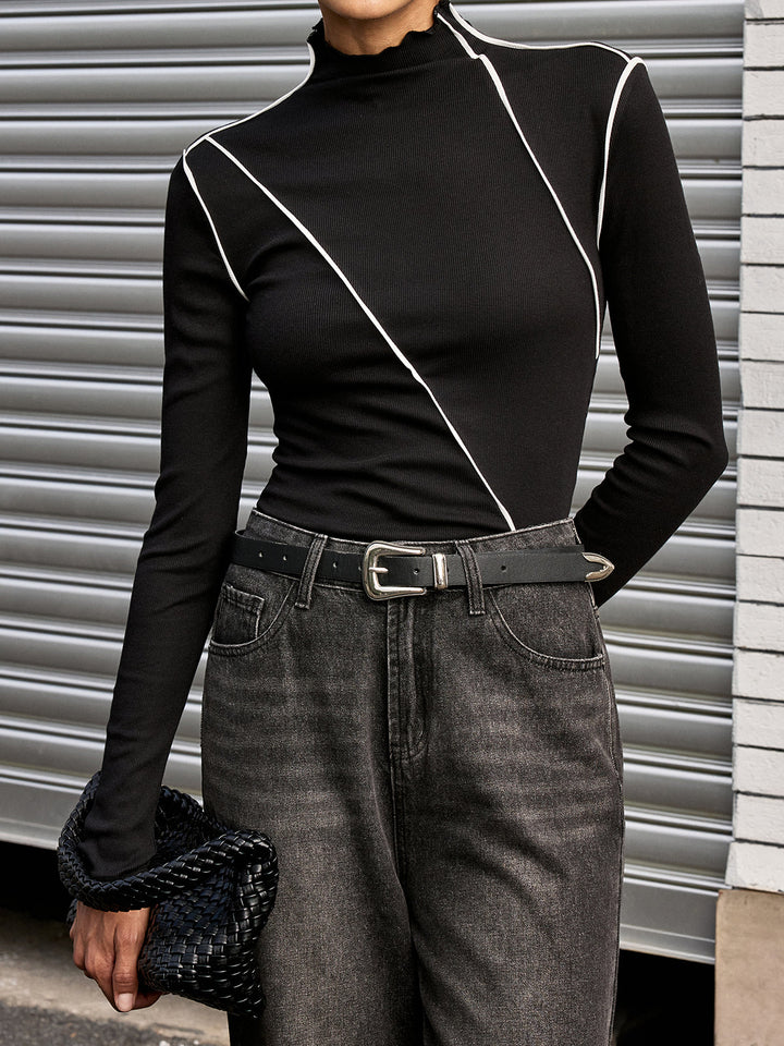 Contrast Asymmetric Piping Mock-Neck T-Shirt