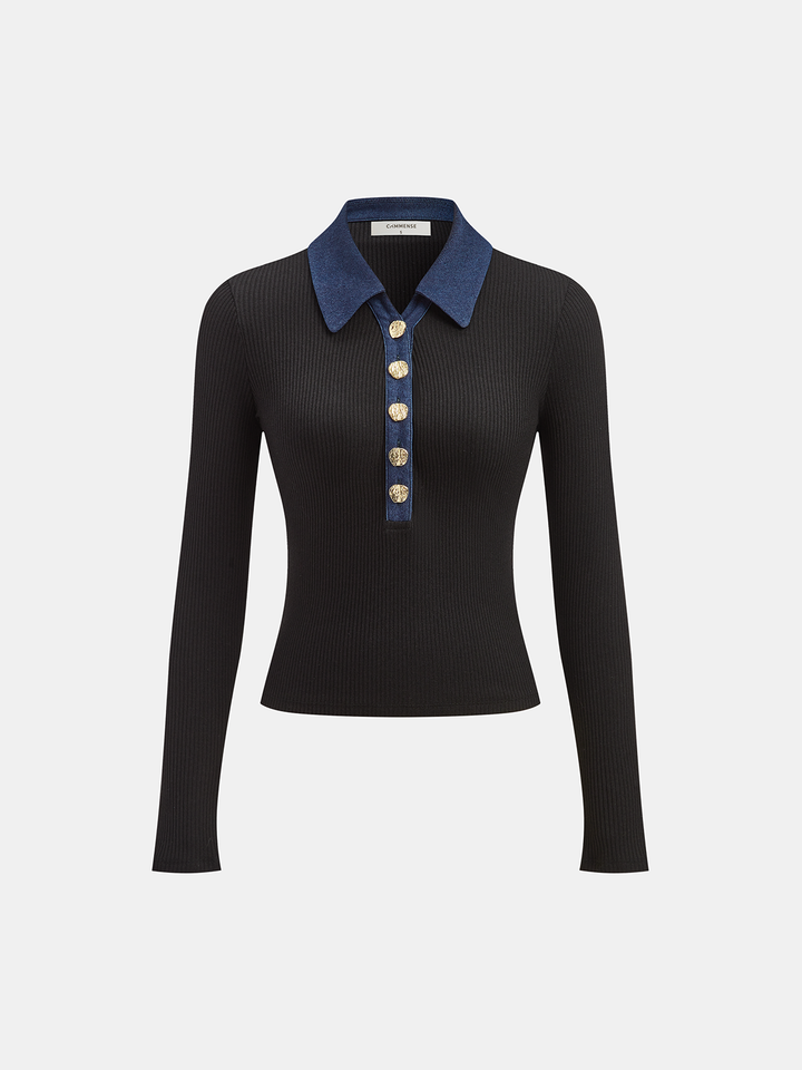 Contrast Collar Metal Button Ribbed Knit T-Shirt