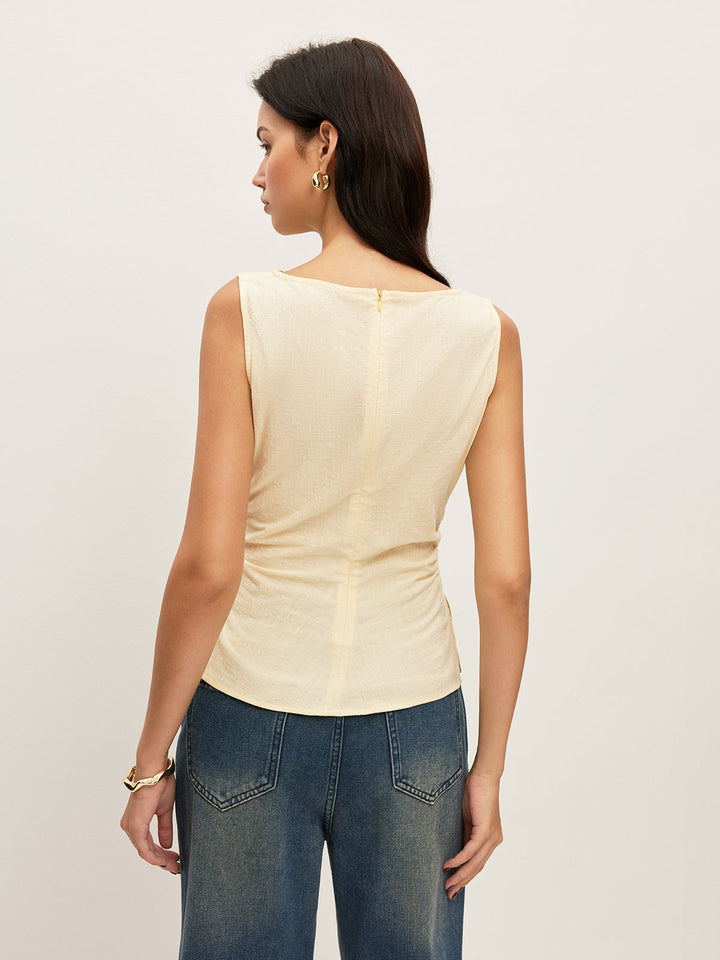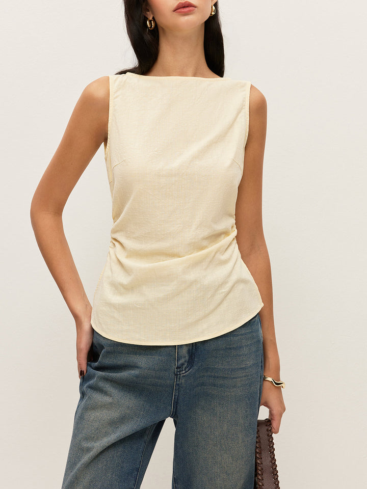 Cotton Solid Boat Neck Ruched Waist Sleeveless Blouse