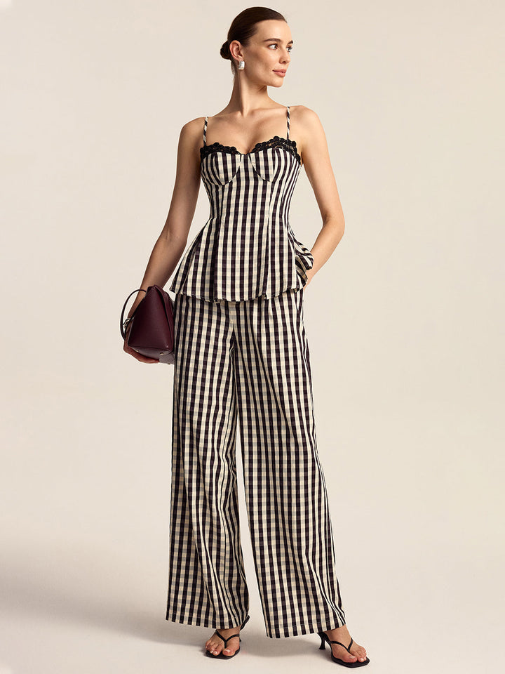 Gingham Spaghetti Strap Peplum Top with Lace Trim