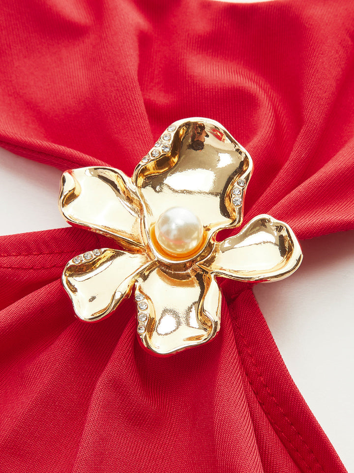 Semi-Sheer Halter Neck Ruched Top with Metal Floral Decor