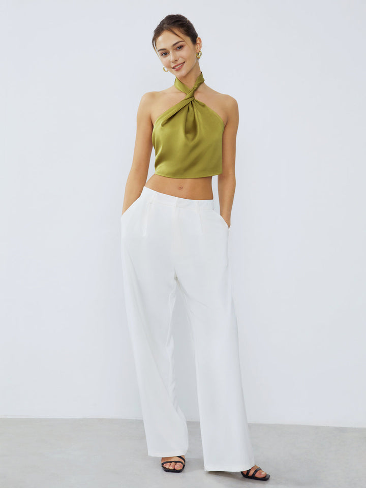 Halter Neck Twist Open Back Satin Crop Top