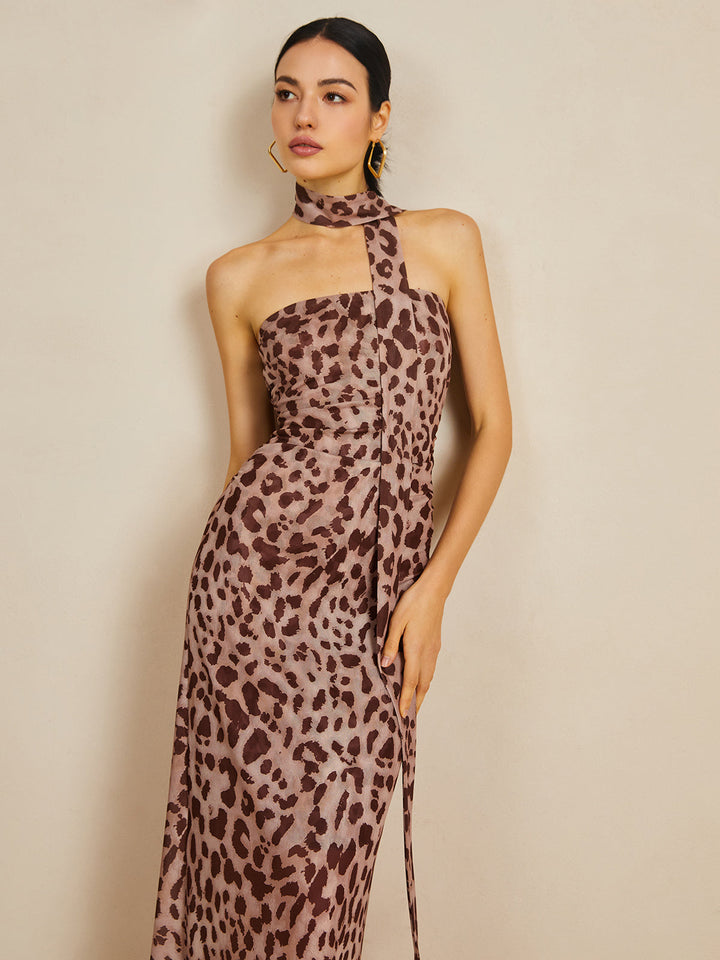 Leopard Print Mesh Halter Midi Dress