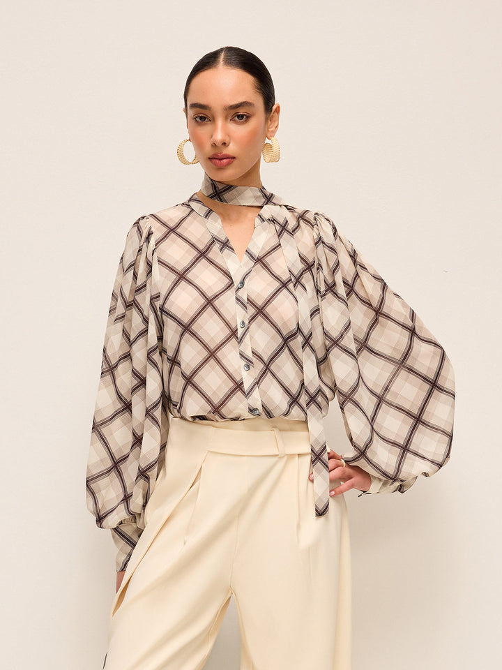 Long-Sleeve Plaid Chiffon Shirt With Neck-Tie Detail