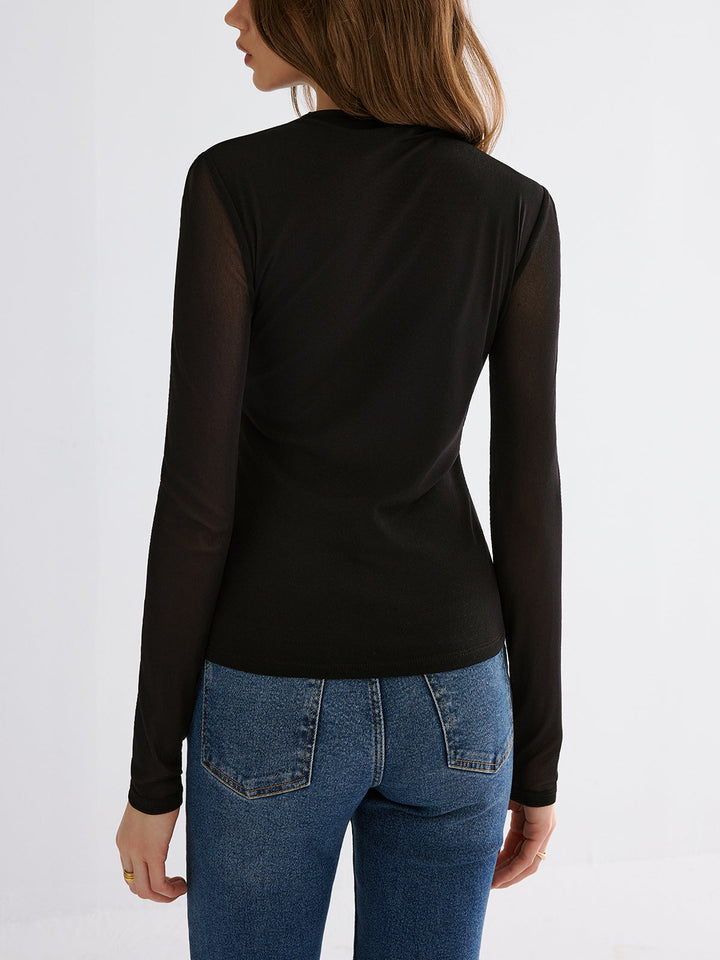 Mesh Paneled Ruched Long Sleeve Knit Top