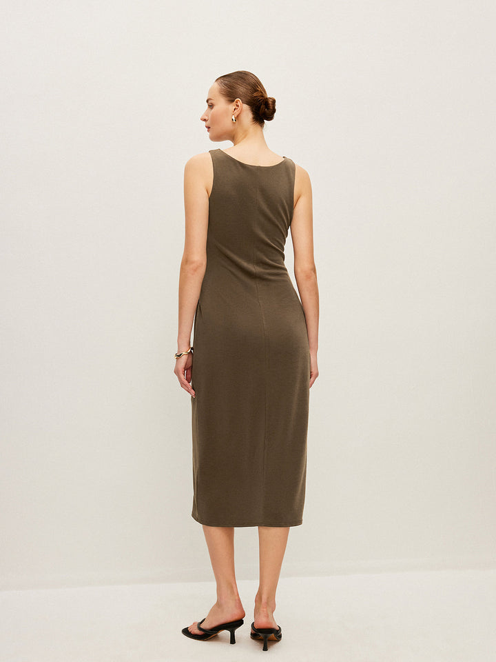 Metal Buckle Detail Shirred Waist Sleeveless Dress