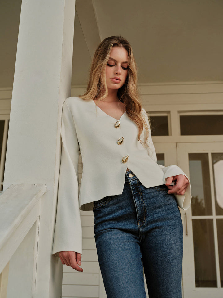 Metal Button V-Neck Cardigan