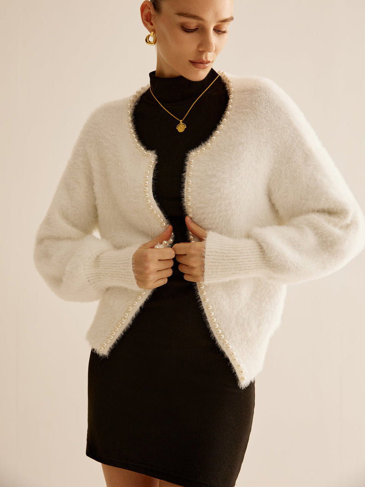 Oversized Pearl Trim Fuzzy Cardiagn