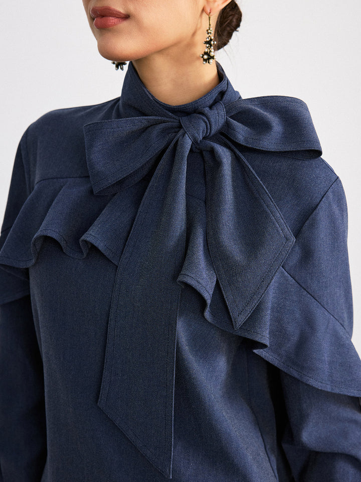 Tie Neck Ruffled Detail Faux Denim Shirt