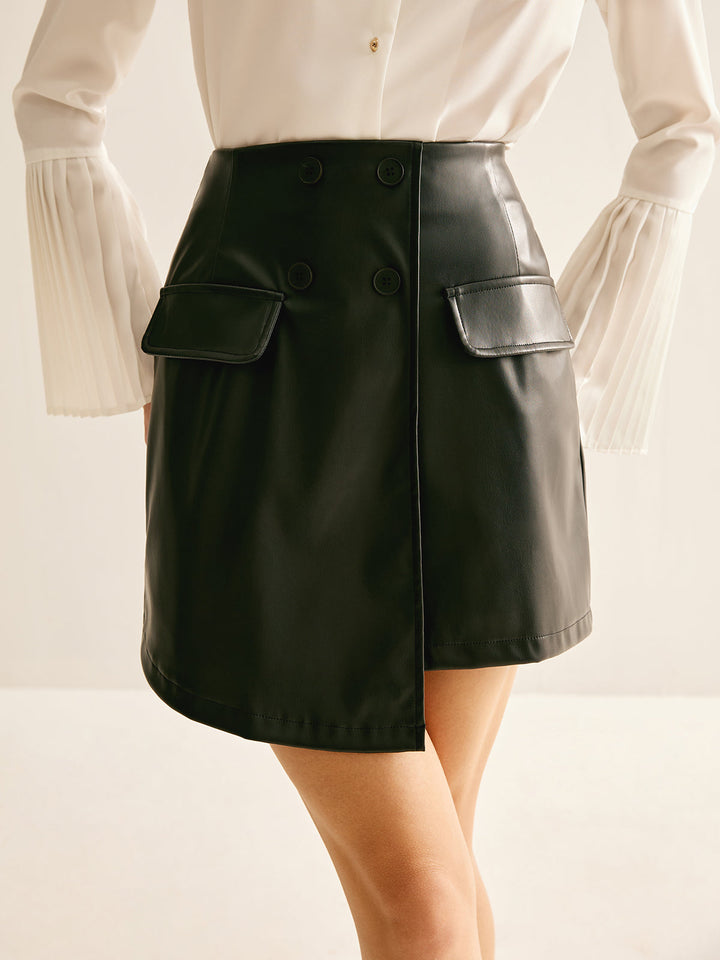 Asimetrik Düğmeli Fermuarlı PU Etek