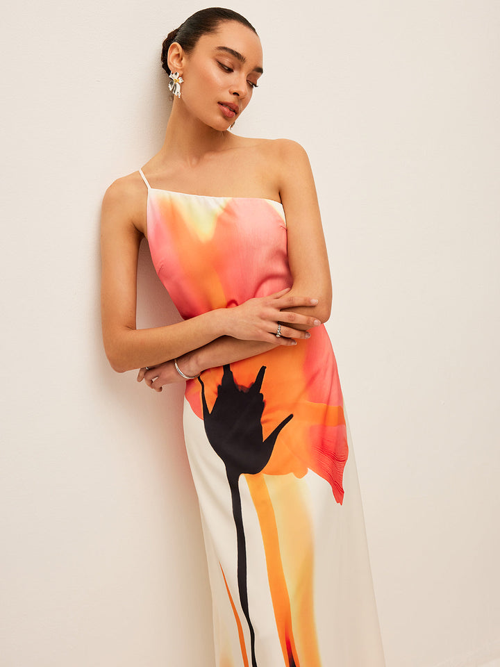 Asimetrik Çiçek Desenli Sırtı Bağcıklı Elbise