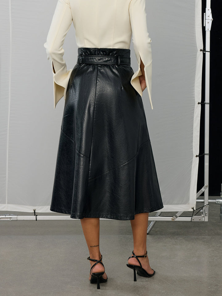 Kemerli PU Deri Uzun Etek