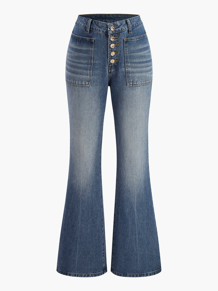 Düğme Detaylı Yüksek Bel Kloş Kot Pantolon