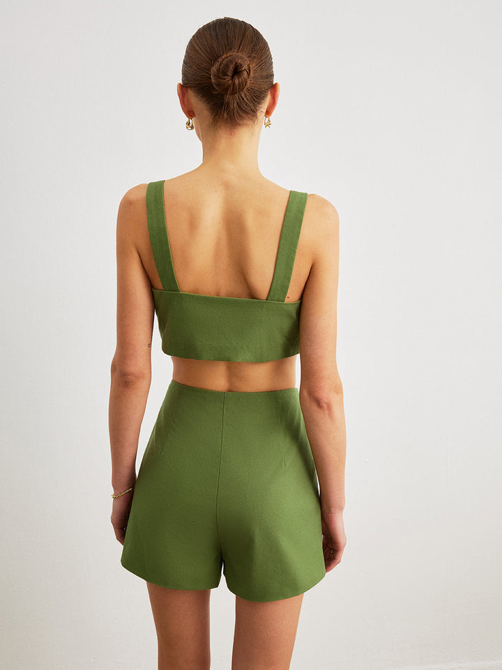 Pamuk ve Keten Çiçek İşlemeli Metal Detaylı Şort Takımı