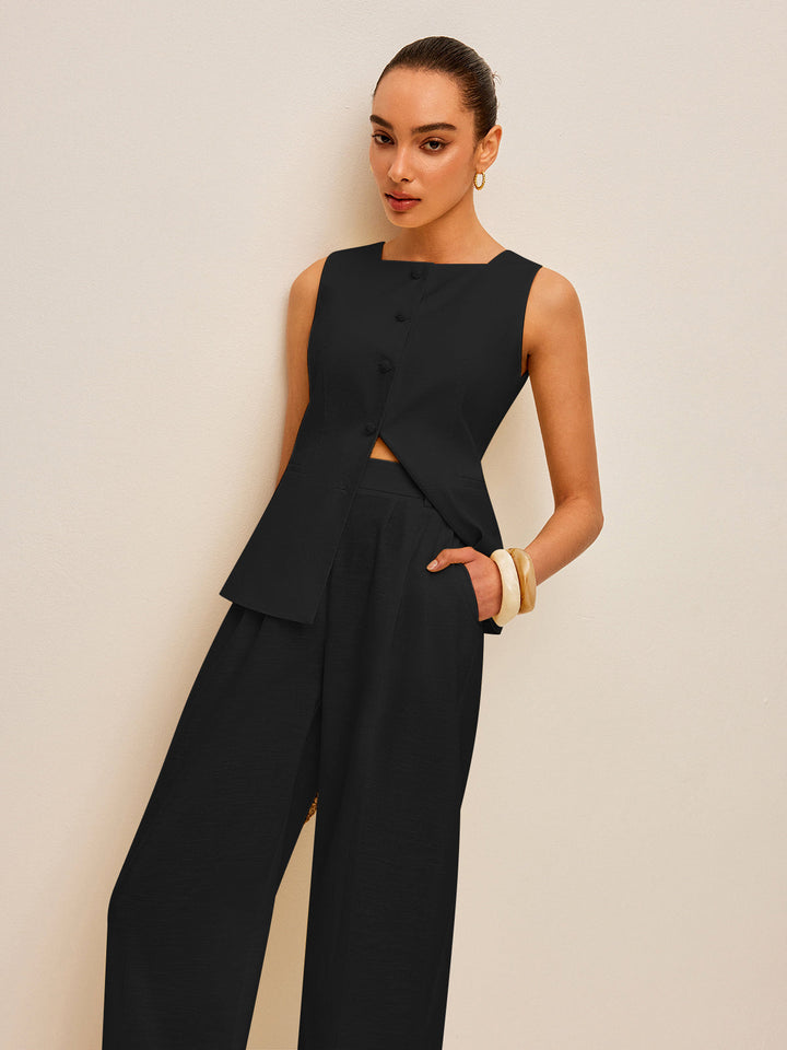 Pamuk ve Keten Cepli Bağcıklı Yelek Pantolon Takımı