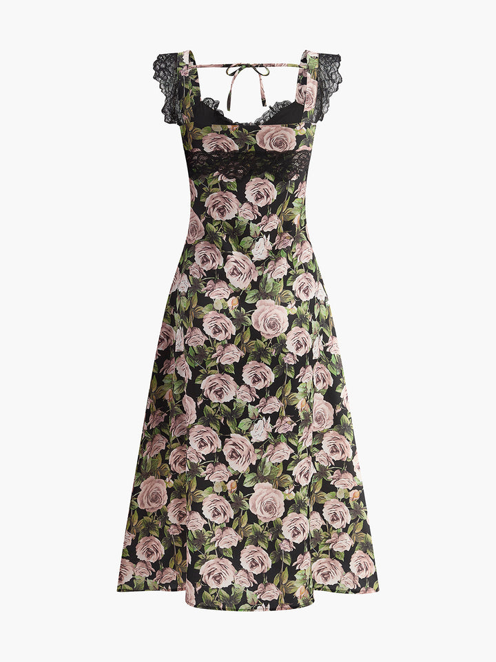 Çiçekli Dantelli Sırtı Bağlamalı Elbise