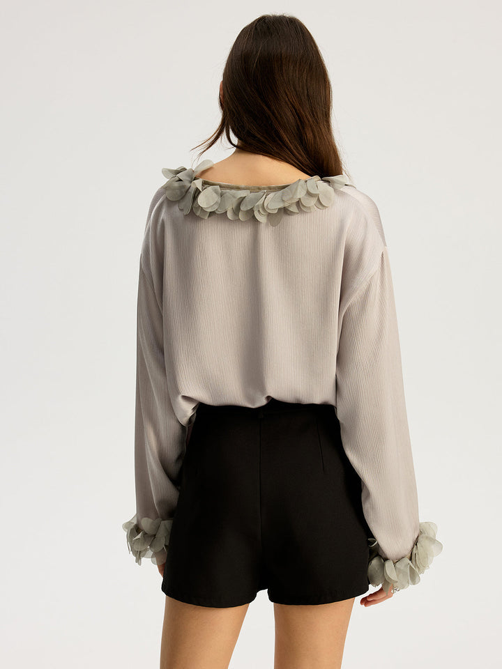 Çiçekli Yaprak Kesimli V Yaka Gömlek