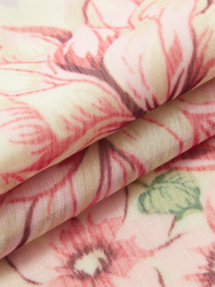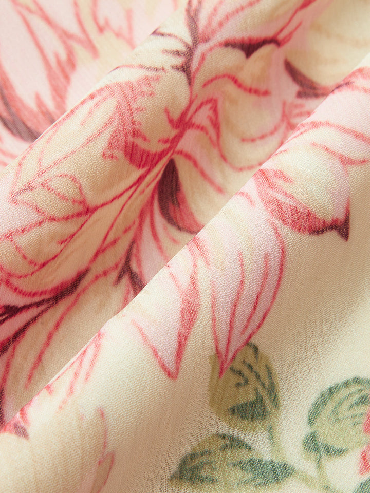 Çiçek Desenli Fiyonk Yakalı Kemerli Uzun Elbise