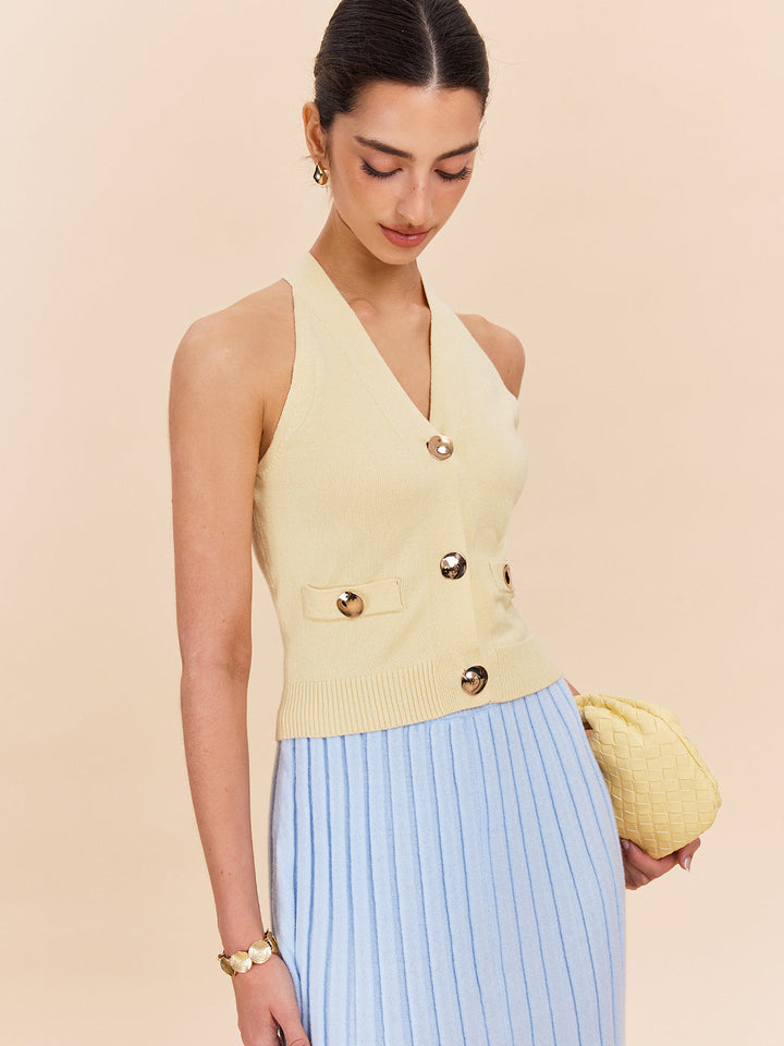 Süs Cepli Halter Yakalı Yivli Örgü Yelek