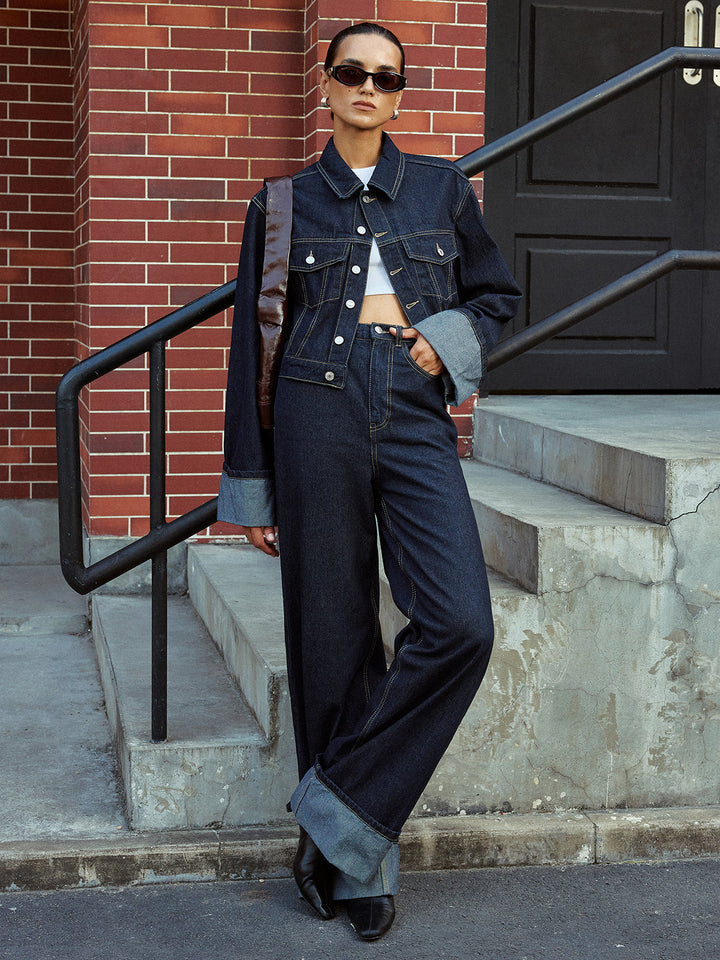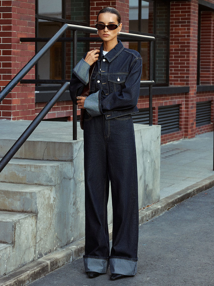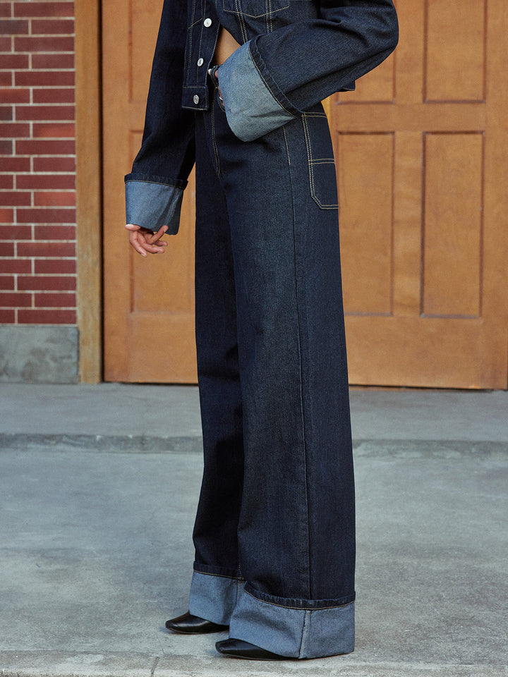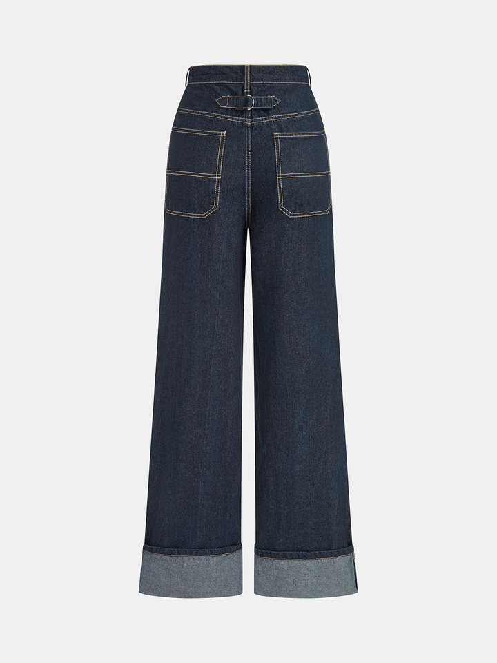 Yüksek Bel Paçalı Geniş Paça Kot Pantolon