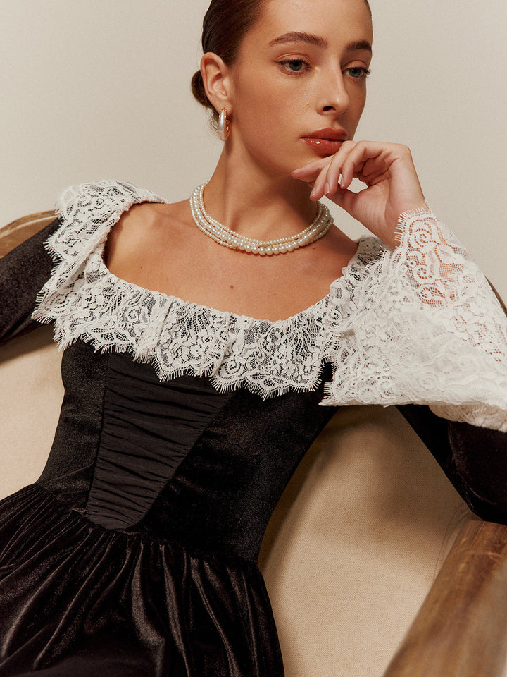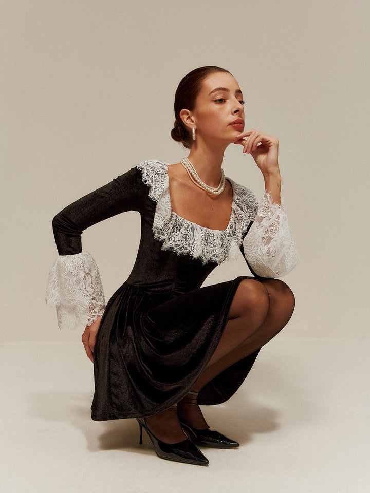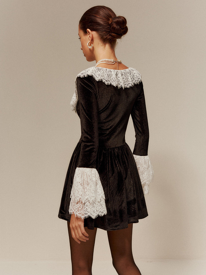 Dantel Kenarlı Kadife Kısa Elbise