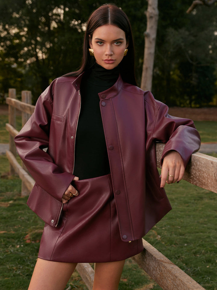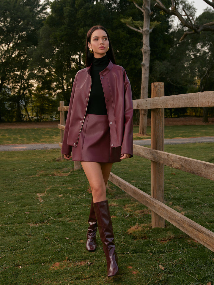 Orta Bel Suni Deri Arka Fermuarlı Mini Etek