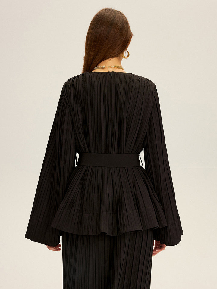 Pileli Çan Kollu Kemerli Peplum Bluz