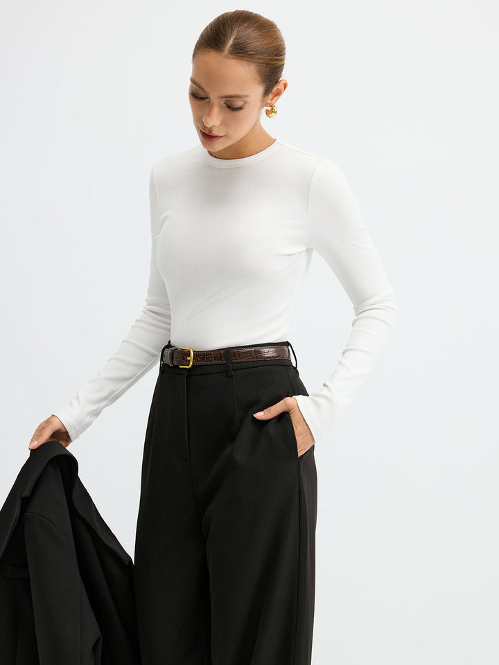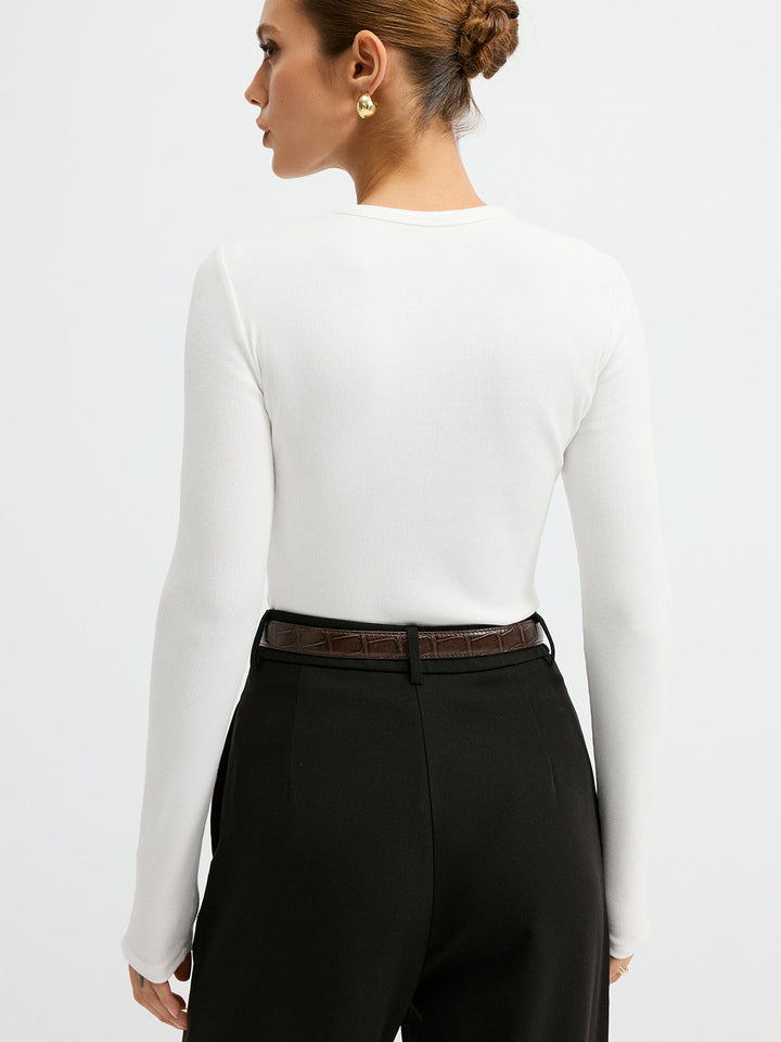 Ribanalı Yuvarlak Yaka Uzun Kollu Tişört