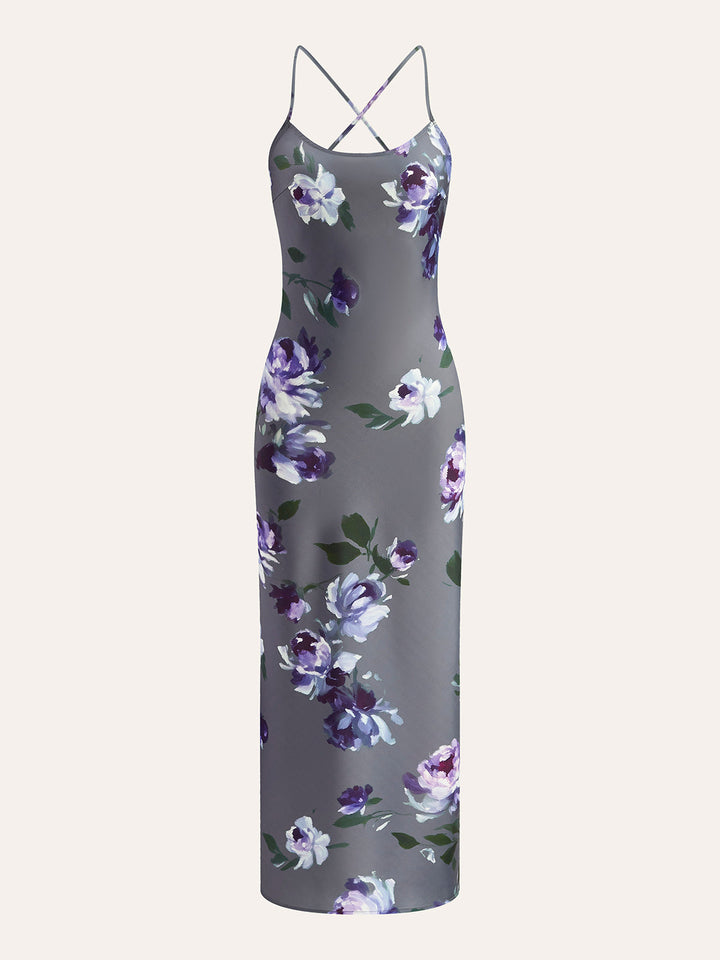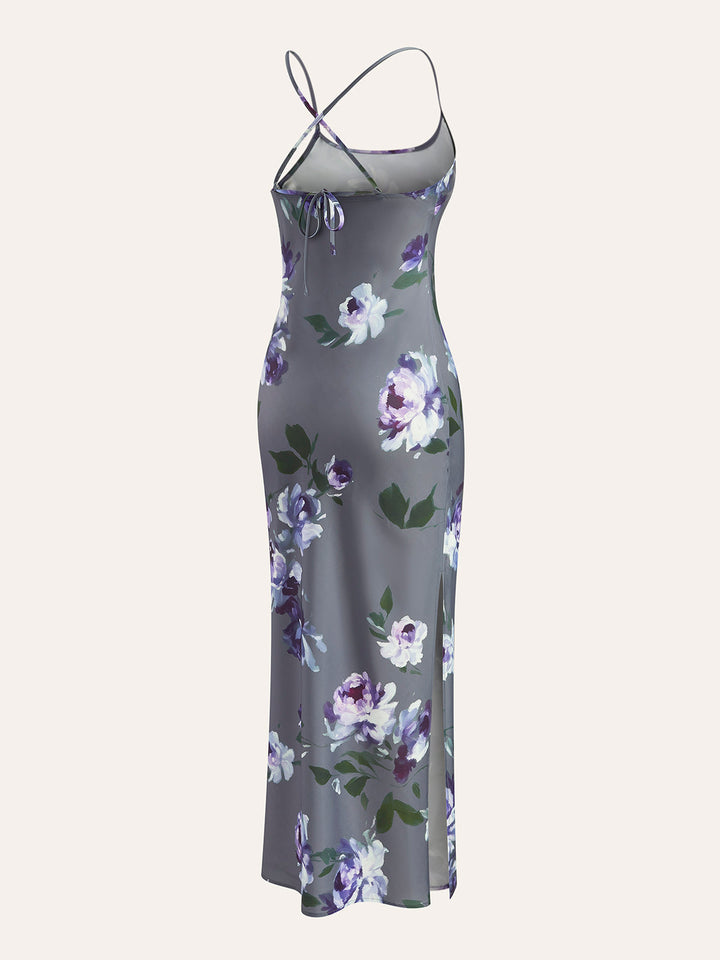 Saten Çiçek Desenli Yan Yırtmaçlı Elbise