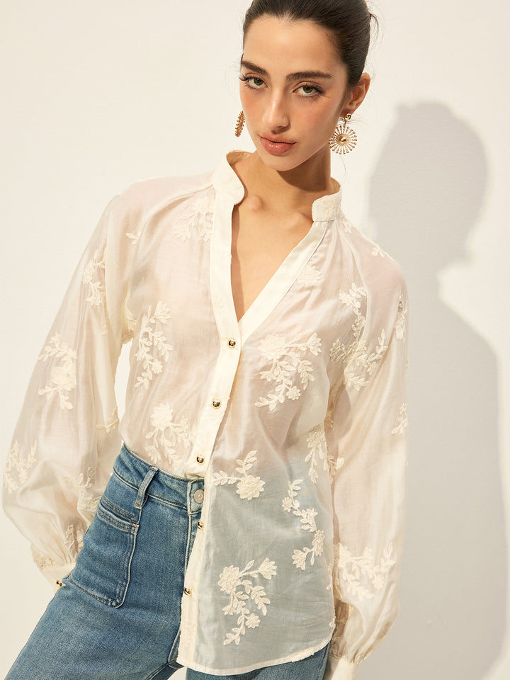 Yarı Şeffaf İşlemeli Düğmeli Bluz