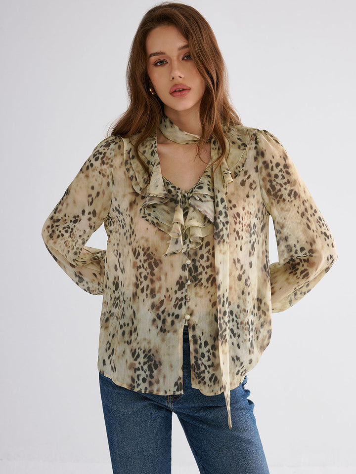 Yarı Şeffaf Volanlı Leopar Desenli Bluz