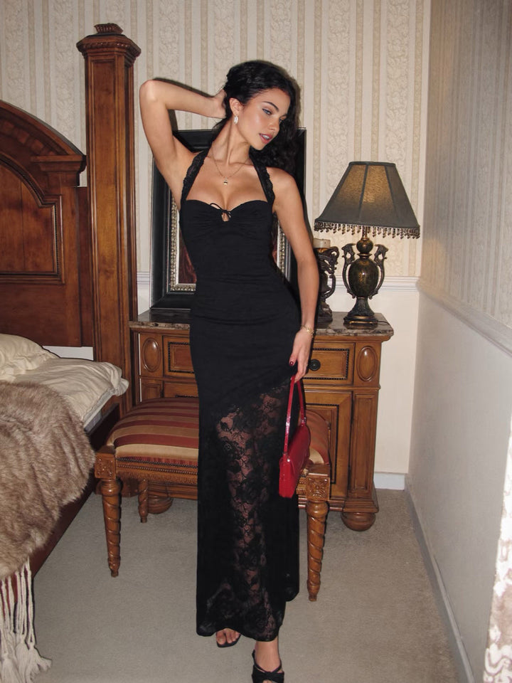 Şeffaf Dantel Panel Askılı Askılı Elbise