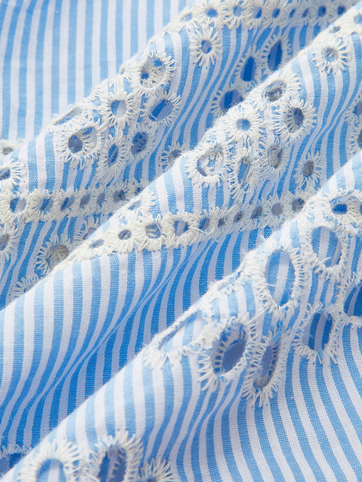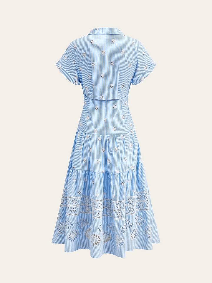 Kısa Kollu İşlemeli Çiçek Çizgili Elbise