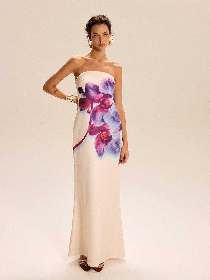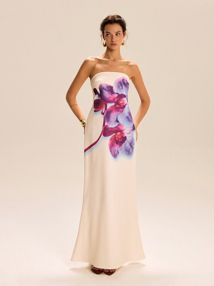 Straplez Çiçek Desenli Uzun Elbise