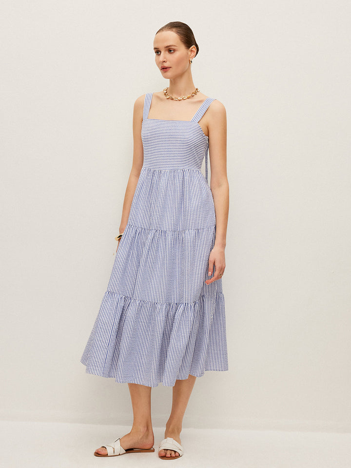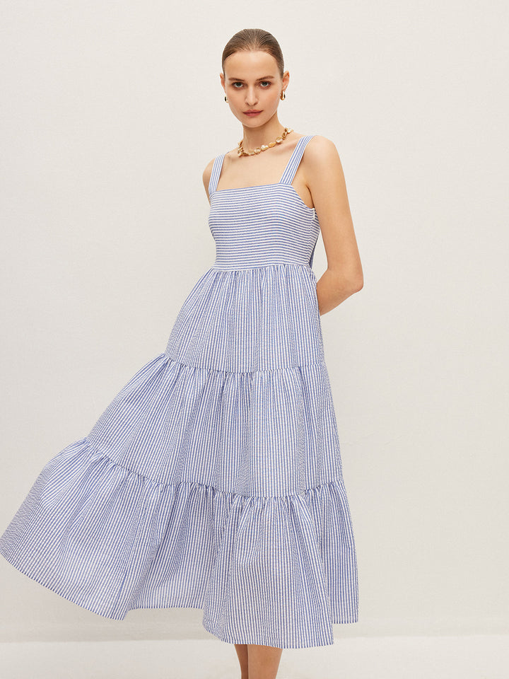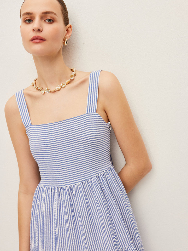 Çizgili Düğme Detaylı Kolsuz Elbise