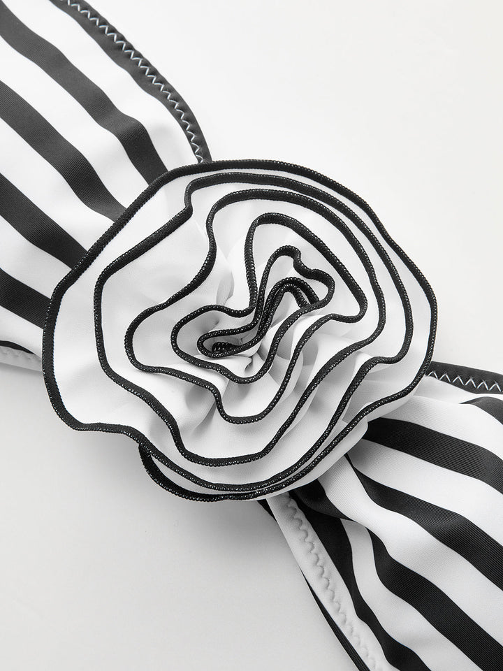 Çizgili Çiçek Detaylı Bandeau Bikini Takımı