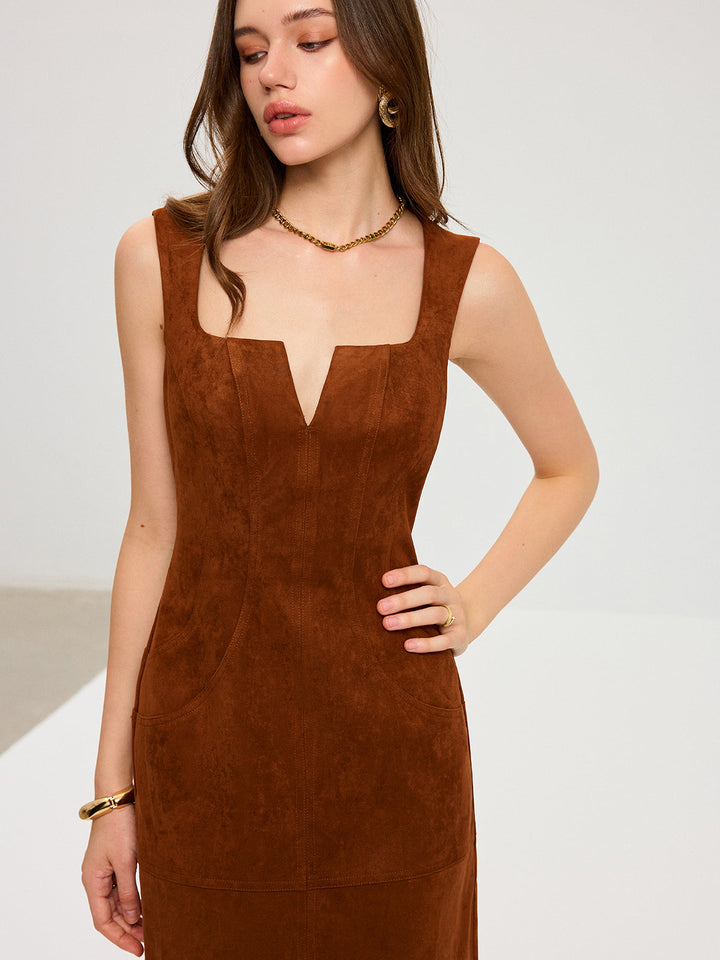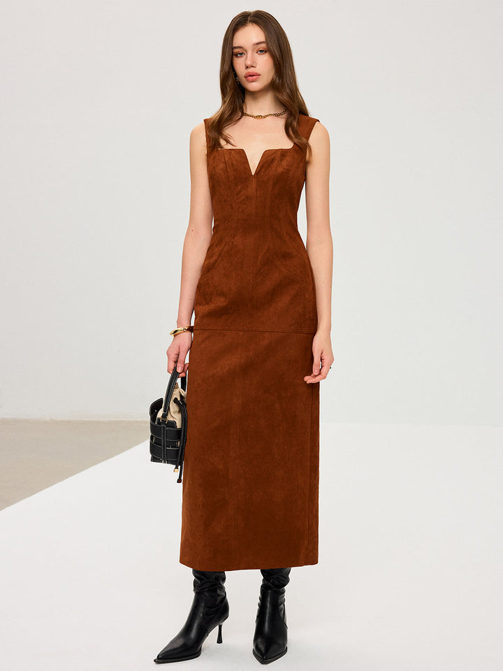 Süet Düşük Yaka Kolsuz Uzun Elbise
