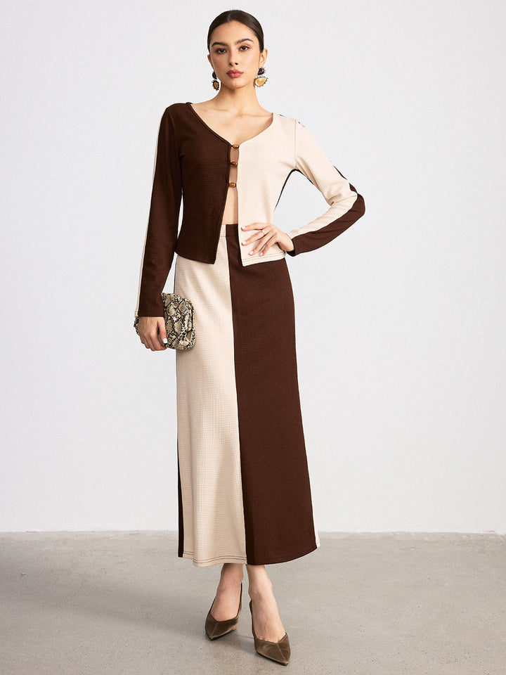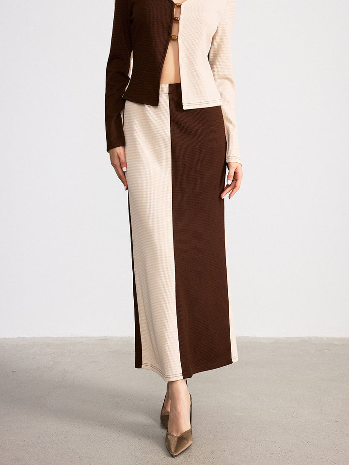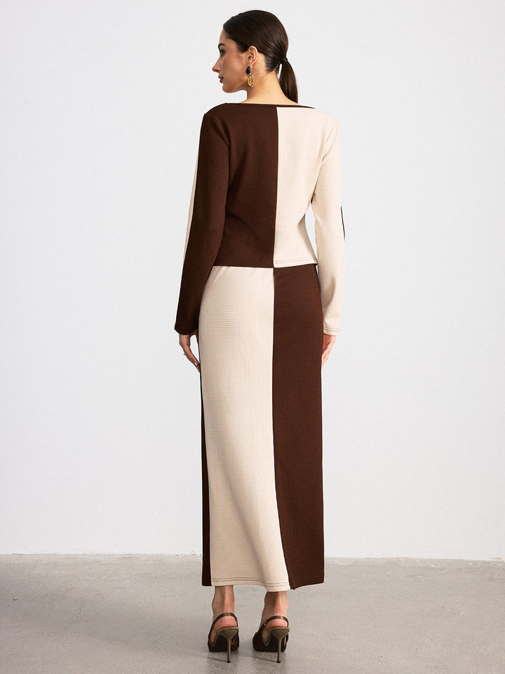 İki Renkli Waffle Örgü Üst ve Etek Takımı