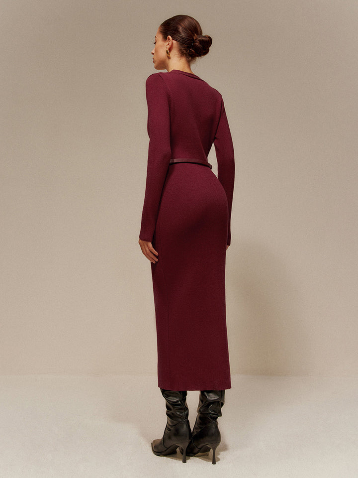 V Yaka Göğüslü Kemerli Kazak Uzun Elbise